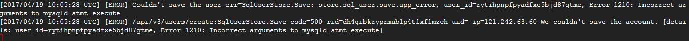 [2017/04/20 04:18:01 UTC] [EROR] Couldn’t save the user err=SqlUserStore.Save: store.sql_user.save.app_error, user_id=poauhy4j5iduipnu1qdgnm3pyy, Error 1210: Incorrect arguments to mysqld_stmt_execute